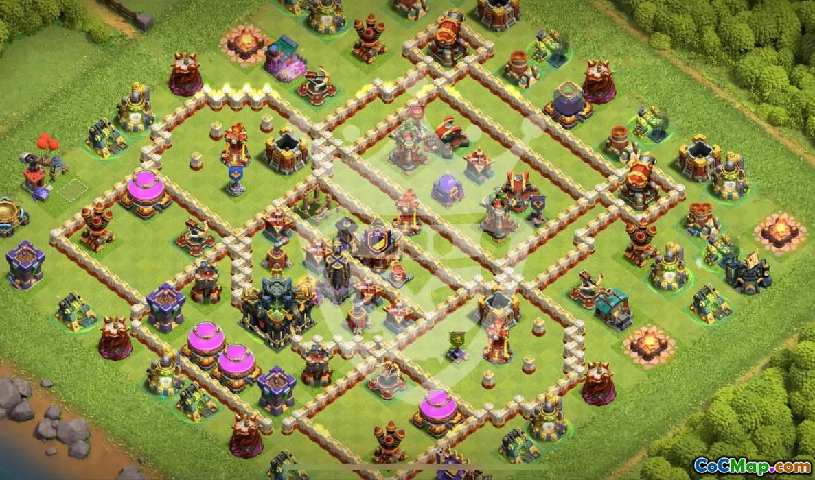 This premium Town Hall 17 hybrid base layout offers a balanced design that effectively defends against various attack strategies in Clash of Clans. It combines strong defenses with efficient resource protection, making it ideal for both farming and war. The layout strategically places key defenses, such as inferno towers and X-bows, to cover critical areas of your home village, while ensuring the Town Hall remains protected yet accessible for certain attack strategies.