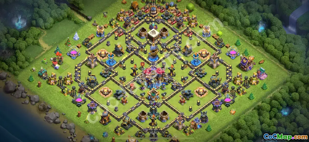 This top-rated TH18 base layout is engineered to provide maximum protection against all attack strategies in Clash of Clans 2025. It features a well-placed, layered defense system that effectively counteracts air and ground assaults, along with strategic placement of traps and walls to slow down enemy troops.