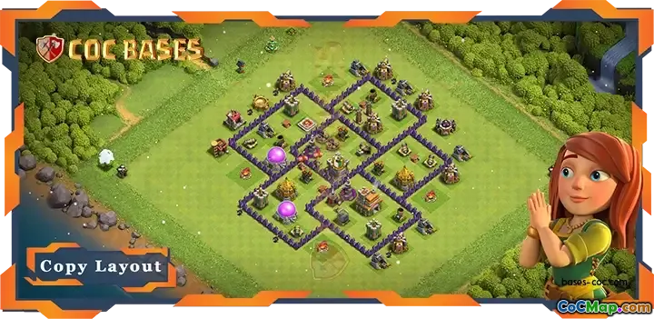 In questo design di base del Municipio 7 (TH7), il layout è appositamente studiato per un approccio ibrido incentrato sulla difesa dagli attacchi sia terrestri che aerei. Il posizionamento strategico delle difese chiave consente un'efficace protezione delle risorse e del Municipio stesso. La base è strutturata per scoraggiare gli aggressori creando un'area ben protetta che riduce al minimo le vulnerabilità.
