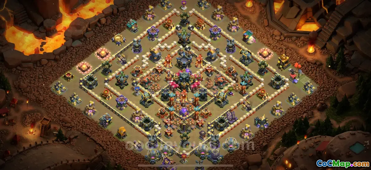 Anti 2 Stars War TH17 基地は、防御とトラップの戦略的な配置が特徴です。イーグル砲兵やインフェルノ タワーなどの主要な防御建物を中心部の近くに配置することで、攻撃者に挑戦することを目的とした設計です。この構成により、対戦相手が複数のスターを確保することが難しくなり、基地への積極的なプッシュを妨げます。