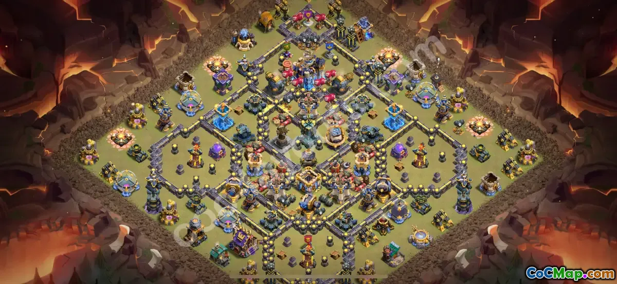 This expertly designed TH18 war base is crafted to maximize defensive efficiency and thwart attackers aiming for 3-star victories. Strategic placement of X-Bows, Inferno Towers, and Clan Castle ensures comprehensive coverage and hitpoints are effectively distributed to withstand powerful attacks.