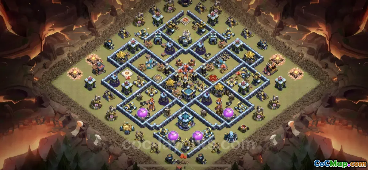 This top-tier TH13 war base features an intricate design that maximizes the protection of key structures, including the Town Hall, defenses, and storages. By placing defensive buildings in a way that forces attackers to navigate through a challenging layout, this meta-base effectively delays and disrupts enemy strategies. Utilizing traps, walls, and effective spacing, the base aims to minimize the overall damage incurred during battles, while also providing troops a chance to counter the attackers effectively.
