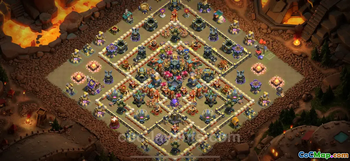 このタウン ホール 17 基地の重要な特徴の 1 つは、防御的な建物と罠の戦略的な配置です。これらの構造物をその適用範囲と有効性を最大化する方法で配置することで、基地は攻撃者を阻止し、容易なスターを確保する能力を制限することができます。この設計には空と地上の防御が組み合わされており、基地の防御を突破しようとする際に航空部隊と陸上部隊の両方がかなりの困難に直面することが保証されます。