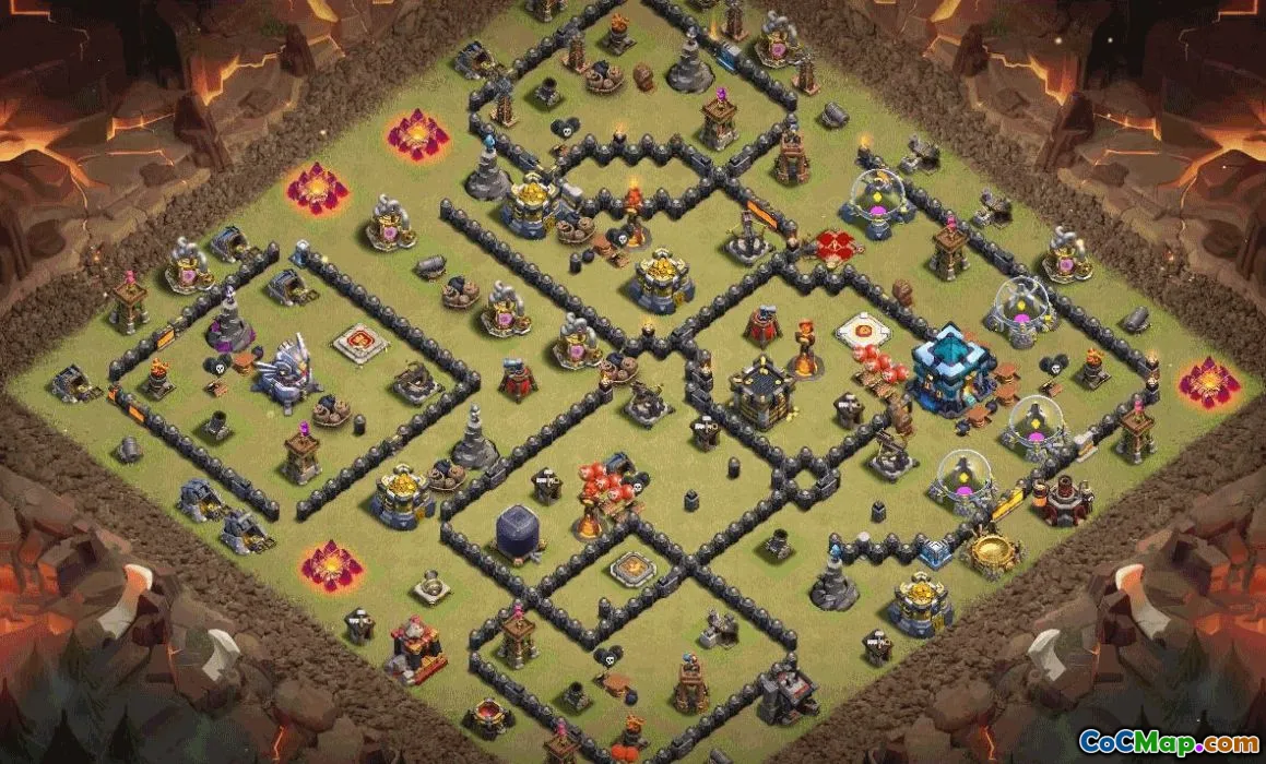 This Town Hall 13 base is engineered to defend against popular TH13 attack plans while keeping your resources guarded. The layout centers the Town Hall under heavy protection, surrounded by an Eagle Artillery and multi-layered walls to slow both air and ground assaults. It also uses carefully placed traps and compartments to disrupt funnels and force attackers into predefined paths.