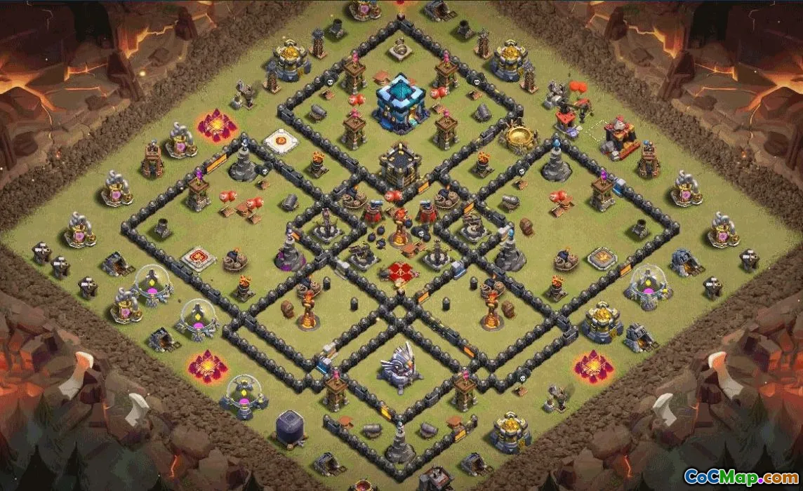 Key features include a carefully planned funnel and compartment layout that forces attackers into kill zones where splash damage and high‑damage defenses can counter them. Traps and Bombs are positioned to surprise Wall Breakers and heavy waves while keeping critical structures safe. The outer ring protects resource storages, while air defenses are spread to reduce the impact of Dragons and Balloons. This balance makes the base resilient for Clan Wars and competitive in Legend leagues.