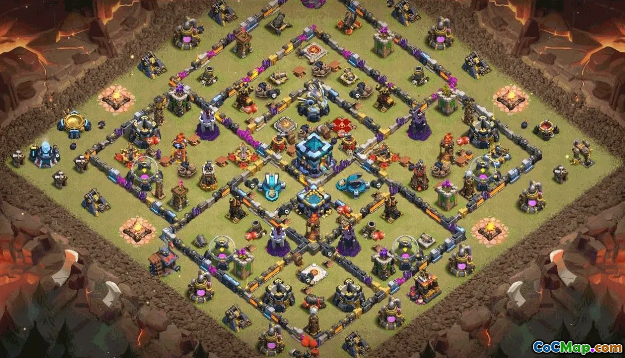 This Town Hall 13 base is built for home village stability and competitive play. Its core centers on the Town Hall, protected by layered defenses and traps that slow and blunt attacks. Storages and collectors are positioned to misdirect foes, while the Clan Castle and hero altars reinforce defense. A shareable copy link lets you apply this exact setup to your TH13 base with a single tap.
