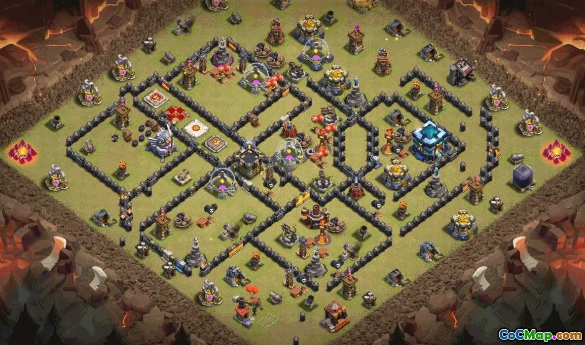 Key features include a tightly protected core around the Town Hall, with splash defenses arranged to cover every approach and air defenses positioned to deter air raids. Traps and bombs are placed to punish wall-breakers and mass armies, while outer compartments slow advances and create safe funnels. This TH13 setup offers solid anti-3-star potential for clan wars and remains versatile for farming and trophy pushing.