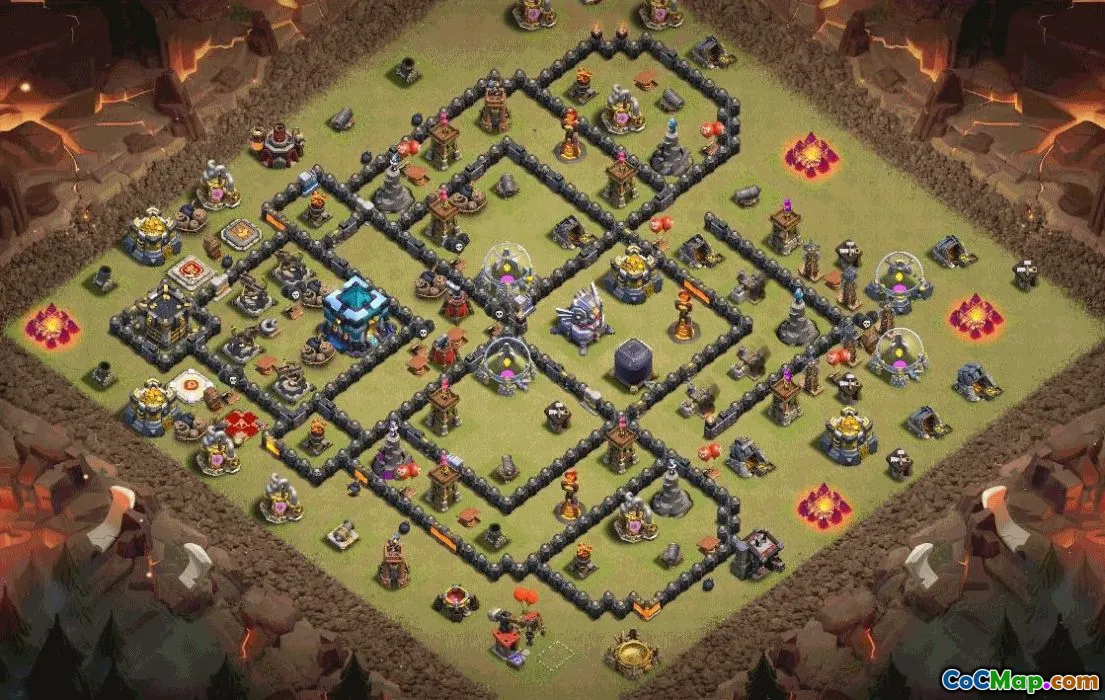 This Town Hall 13 layout emphasizes a robust core with layered defenses and a ready-to-copy structure. The central Town Hall is protected by multiple compartments, slowing heavy siege and forcing attackers to navigate walls before reaching the core. The Eagle Artillery sits behind a protective ring, while splash defenses cover key approach angles. Storages are distributed to complicate raiding and farming, and the Clan Castle is positioned to maximize support during counterattacks.