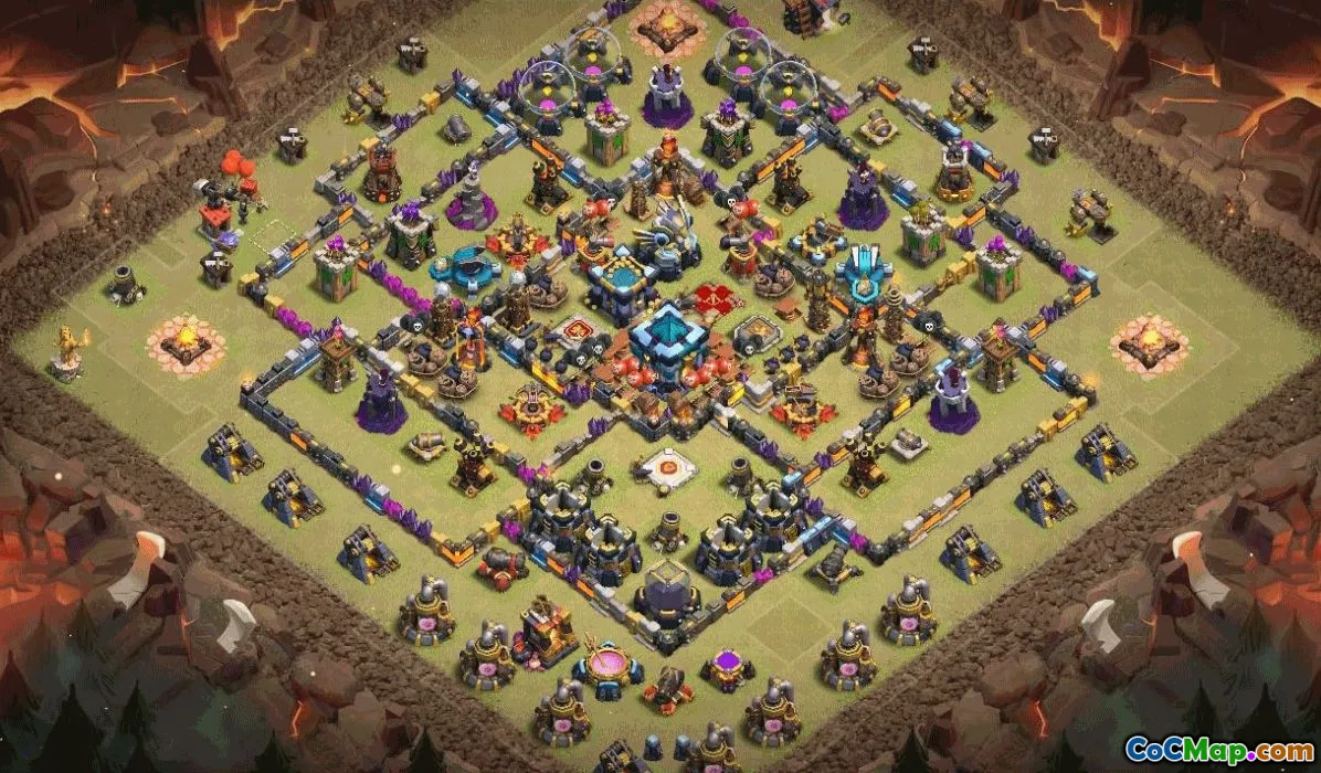 This Town Hall 13 layout is built for hybrid play, offering robust loot protection and reliable war performance. It is designed to be easily copied using the included link, so players can replicate a proven setup without rebuilding from scratch. Core protection centers on a compact Town Hall hub surrounded by layered defenses and critical traps to deter breaches, making it easy to share with clan mates.