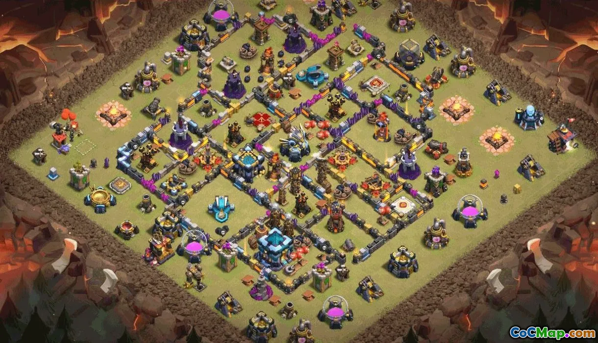 This copy-ready Town Hall 13 base is built for home village, trophy maps, and war layouts. It centers the Town Hall behind walls with a core of Eagle Artillery, Inferno Towers, X-Bows, and Air Defenses. The compartments slow both ground and air assaults, while traps disrupt paths. A protected Clan Castle and compact hero altars boost resilience. A shareable reference accompanies the layout, presented here without a live link.