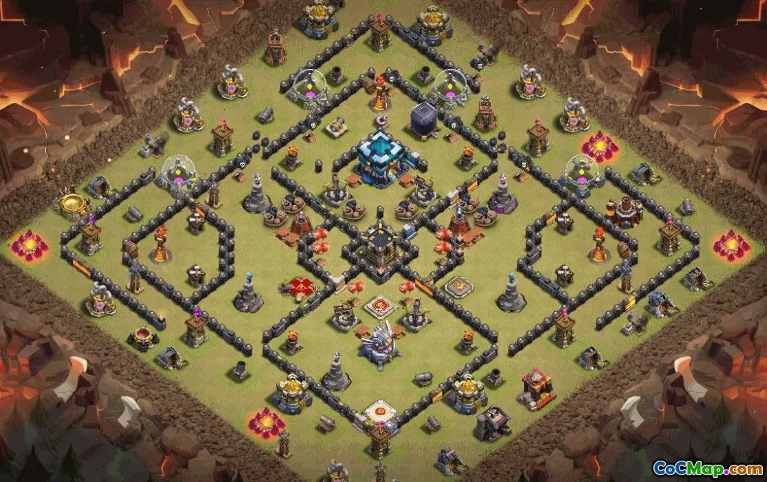 This Clash of Clans Town Hall 13 base is built to defend against air and ground assaults while safeguarding your resource storages. The core centers on the Town Hall with layered walls and tightly grouped defenses, creating powerful funnels that slow and redirect enemy troops. Thoughtful trap placement and well-positioned air defenses disrupt common TH13 attack patterns, while outer compartments deter loot-focused raids and help preserve dark elixir and gold.