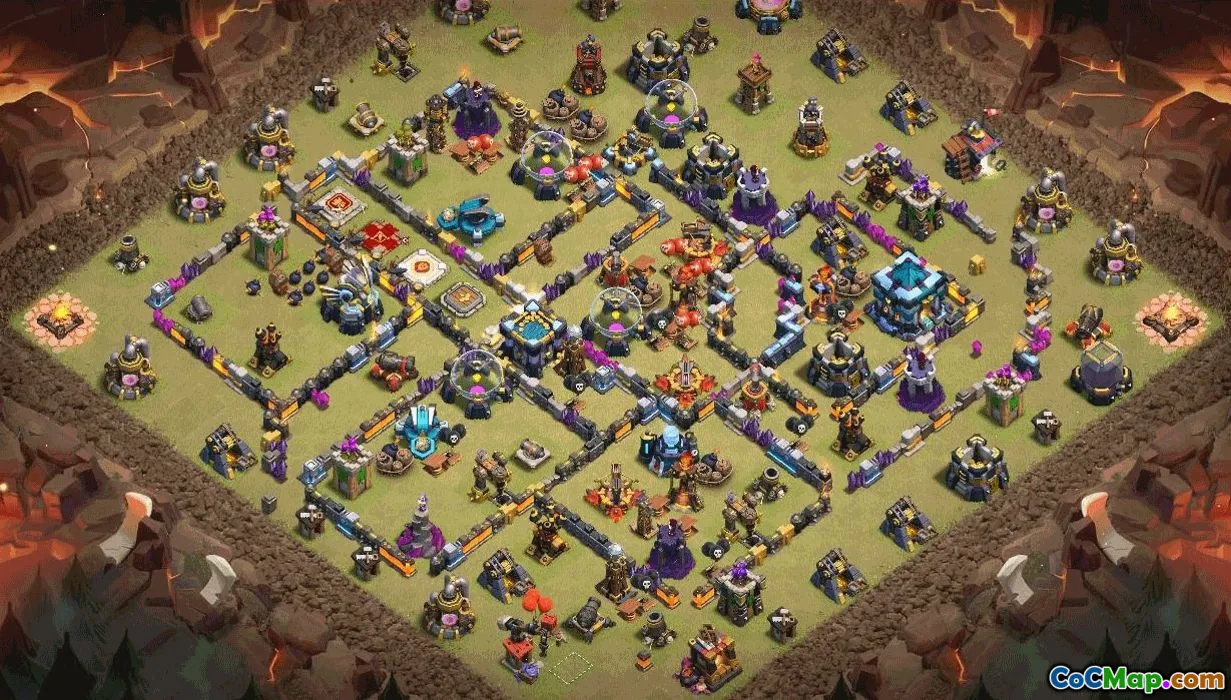 Trap placement and compartment design funnel enemies and slow powerful attackers. A layered perimeter slows hog riders, yet keeps storages accessible for farming. The core is protected by well-positioned heroes and defensive buildings, creating a resilient TH13 shield ideal for Clan War bases and ladder defenses while still offering solid resource retention.