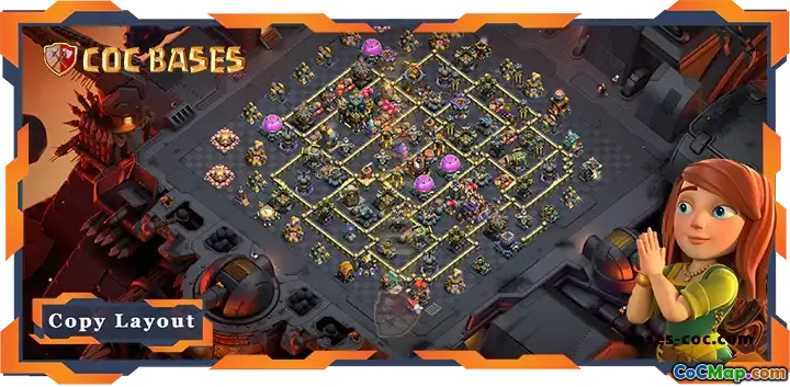 This top TH17 war base layout is strategically designed to maximize defense and prevent three-star completions. The placement of splash defenses, traps, and walls creates a formidable barrier for attackers, making it difficult to breach core areas.