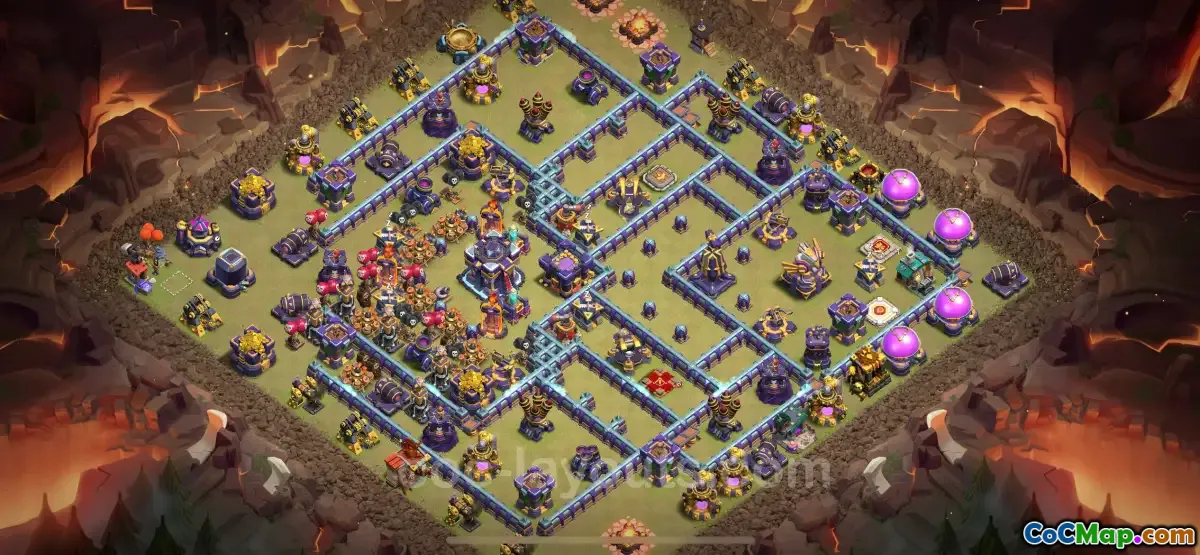 This top-tier base design focuses on maximizing defensive capabilities while maintaining an aesthetically pleasing layout. Players can copy this design to enhance their own defensive strategies during wars. The base features a well-thought-out arrangement of buildings and traps that are intended to divert enemies and protect key assets. With this setup, players can bolster their chances of emerging victorious against formidable opponents in Clan War Leagues.