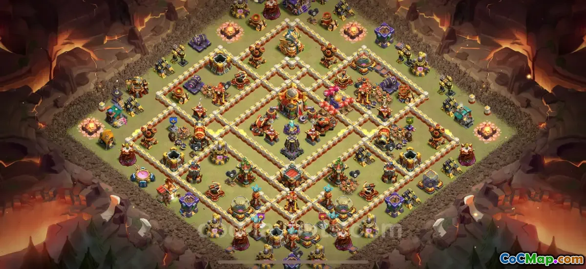 Designed for Town Hall 16 CWL battles in 2025, this war base centers on a tightly guarded core that protects the Town Hall while denying direct access. An Eagle Artillery sits at the heart of fortified compartments, flanked by multiple Inferno Towers and X-Bows to deliver overlapping coverage. The outer rings use deliberate wall placement to funnel ground and air troops into traps, limiting the attackers’ options while keeping the Clan Castle defendable.