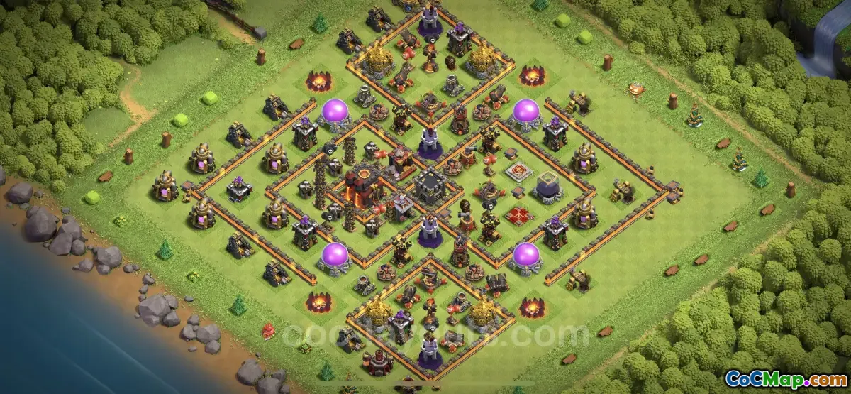 This TH10 base design incorporates effective anti-everything elements, which means it can withstand various types of attacks, whether they come from ground troops or aerial units. The strategic placement of defensive structures, traps, and walls is key to this design. It ensures that attackers face significant challenges when attempting to penetrate the base. The configuration aims to minimize vulnerabilities and protect high-value targets such as the Clan Castle, the Eagle Artillery, and storages.