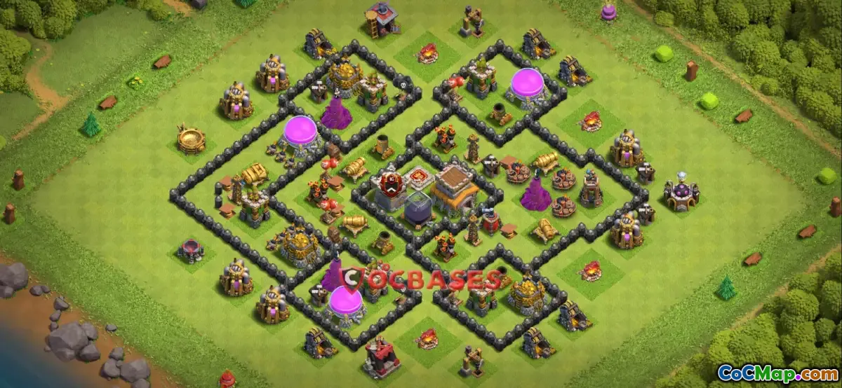 A farming base design at Town Hall 8 is typically structured to ensure that the most valuable resources are safeguarded. This includes placing storages within the base’s core and surrounding them with defensive structures to deter attackers. Additionally, it is common to position traps and defenses in locations where they can catch enemy troops off guard, helping to minimize resource loss during attacks.