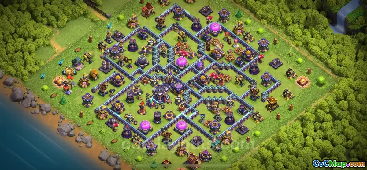 이 디자인은 타운홀 15에서 사용할 수 있는 새로운 방어 건물과 업그레이드를 고려하여 기본 건물의 최신 발전을 활용합니다. 여기에는 다양한 각도와 목표를 포괄할 수 있도록 효과적으로 배치되는 인페르노 타워, X-활, 산탄총과 같은 기능이 포함됩니다. 공격자가 기지의 핵심을 쉽게 관통하는 것을 방지합니다. 결과적으로 이 기지는 시청을 보호할 뿐만 아니라 창고와 혈맹 성채 병력의 안전도 보장합니다.