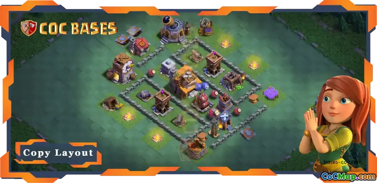 bh04라고 불리는 기본 레이아웃은 방어 및 자원 수집 강화를 목표로 하는 세 가지 섹션으로 설계되었습니다. 기지의 중심에는 적의 공격으로부터 기지를 보호할 수 있는 전략적 위치에 있는 건축 홀이 있습니다. 이 중앙 배치는 주변의 나머지 방어를 위한 거점 역할을 하기 때문에 매우 중요합니다.