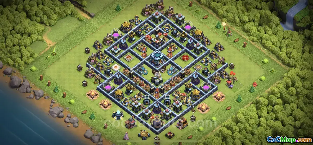 The Town Hall 13 base design in Clash of Clans is strategically crafted to excel in defense against various attacks, especially within the competitive Legend League. These base layouts are commonly referred to as "anti-everything" bases, as they are designed to thwart a wide range of attack strategies, making it challenging for opponents to secure a three-star victory. The goal of these bases is to protect the Town Hall, as well as key defensive structures, ensuring that players can maintain their trophy count and ranking in the league.
