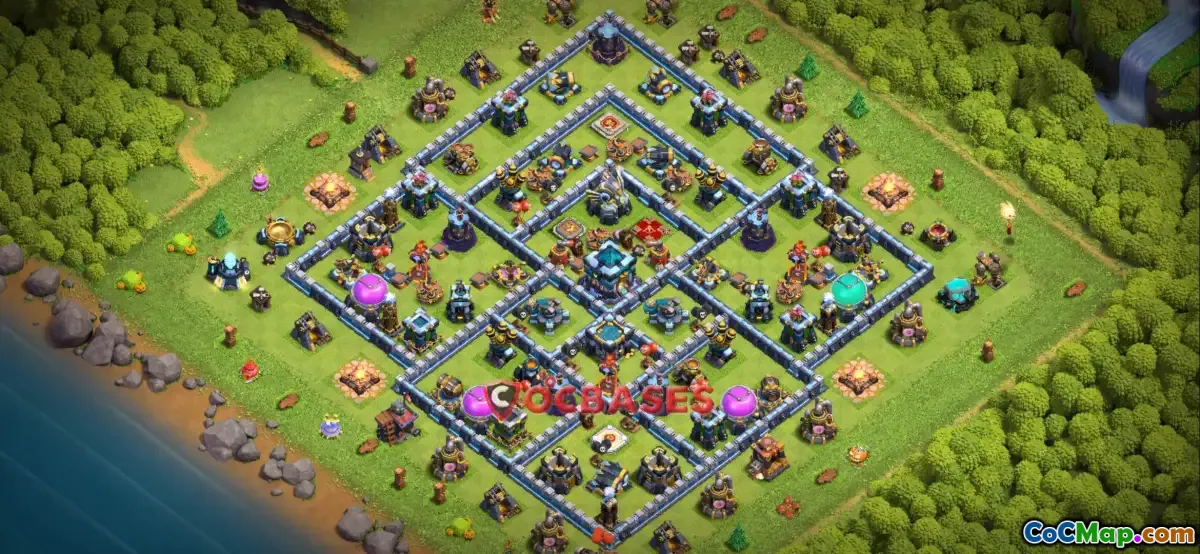 The Town Hall 13 trophy base features elements that focus on anti-two-star strategies. This means the layout is optimized to prevent attackers from easily achieving two-star victories, which would occur if they successfully destroy both the Town Hall and a specific percentage of other buildings. By placing the Town Hall in the center of the base and surrounding it with valuable defensive structures, players can force attackers into tough situations where gaining two stars becomes increasingly difficult.