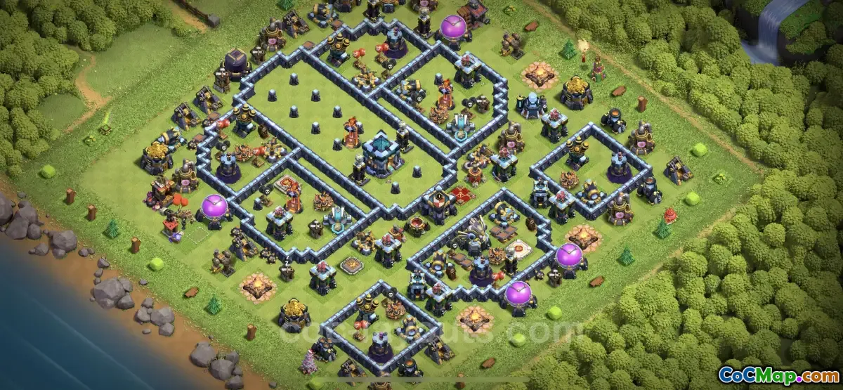 This well-crafted TH13 base offers a powerful combination of defensive capabilities that can thwart air attacks while also protecting important resources and trophies. The layout ensures that vital buildings are well-guarded, meaning that attackers will have a tougher time achieving a three-star victory. By utilizing proper links within the base design, players can maintain a strong defensive stance while gradually collecting trophies as they repel opponents' assaults.