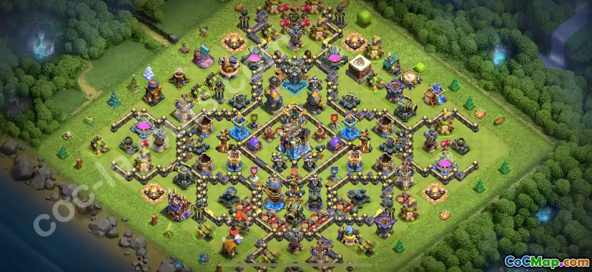 This top-rated TH18 base layout is specially crafted for 2025, offering comprehensive protection against all attack types with its hybrid design. It combines strong defensive structures with strategic placement of heroes, traps, and walls to maximize damage absorption and prevent enemy breakthroughs.