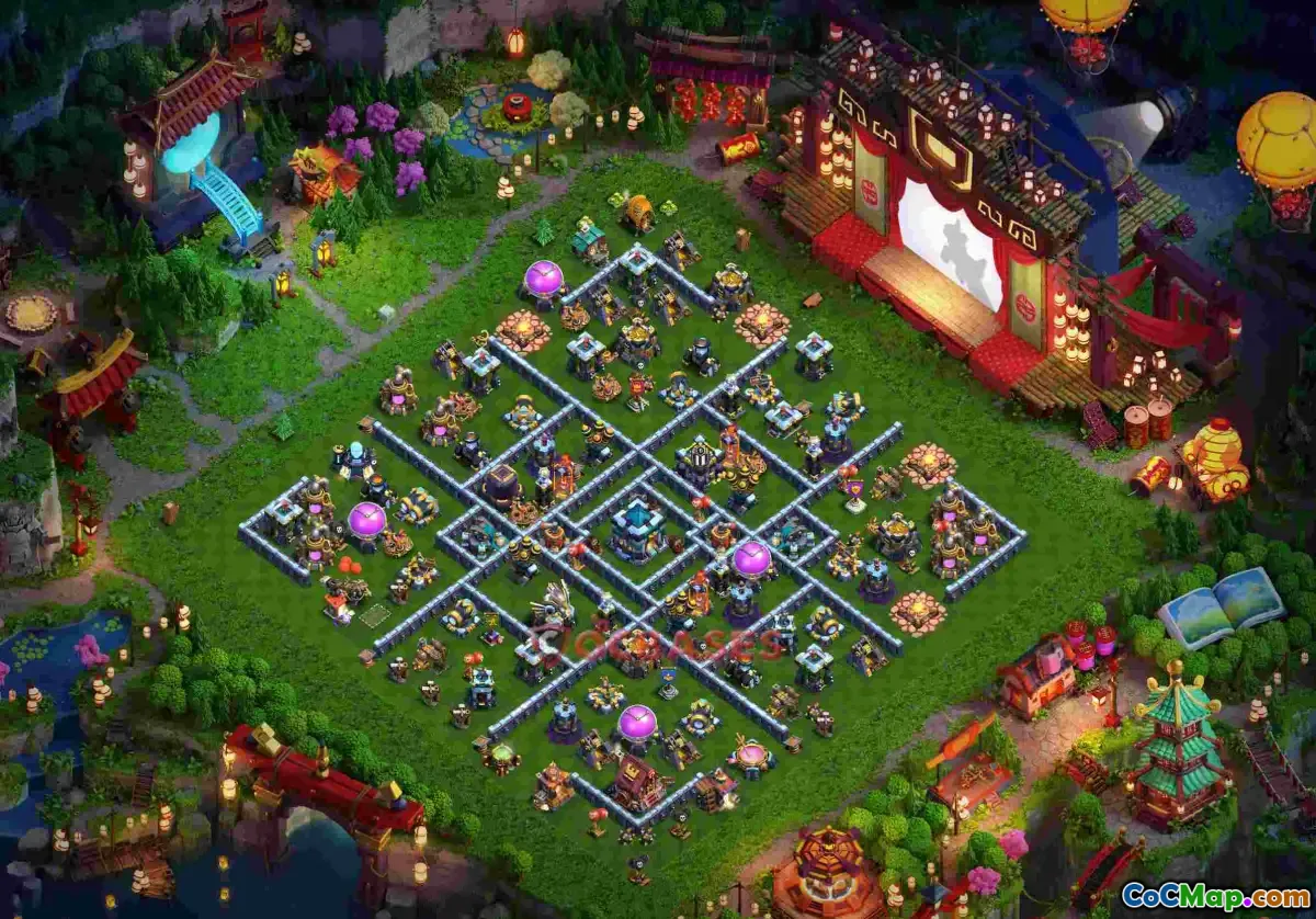 Optimize your TH13 defense with this hybrid layout designed for war, farming, and trophies, featuring the copy link mpmcr for easy setup.