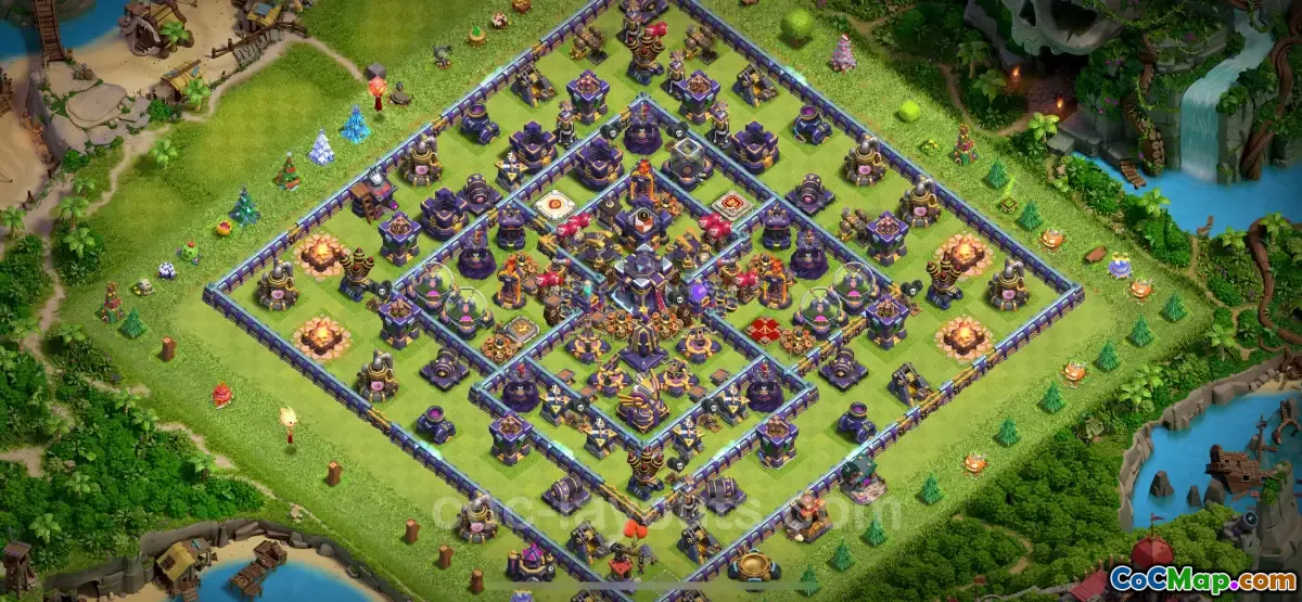The Town Hall Level 15 (TH15) base layout for farming in Clash of Clans focuses on resource defense with a hybrid strategy. This design is crafted specifically to protect vital resources while also providing a robust defense against various attack strategies. The base aims to thwart attackers by being resistant to a range of offensive techniques, thus ensuring that resources remain safeguarded even under frequent assaults.