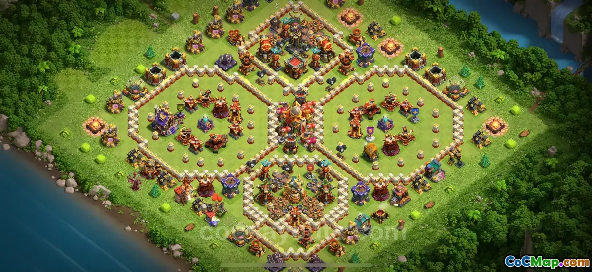 This optimized Trophy (Defense) Base for Town Hall 16 in Clash of Clans 2025 is tailored to maximize trophy retention and prevent enemies from achieving high-star attacks. Its layout strategically shields key defenses and loot storages while maintaining a compact design that confuses attackers.