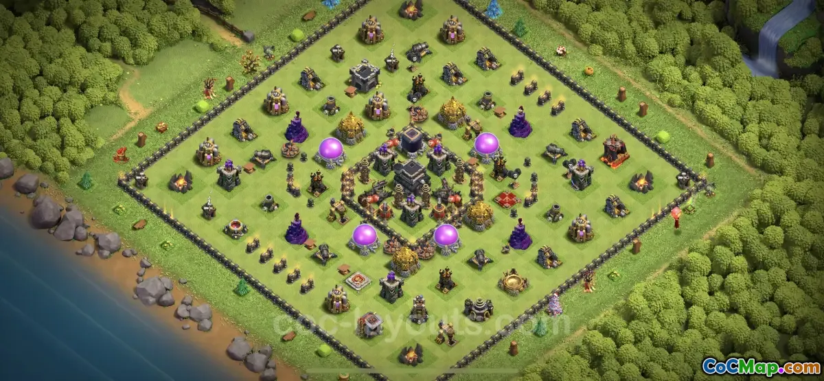 In summary, the hybrid design of the Town Hall 9 base not only prioritizes trophy protection but also ensures that resources are safeguarded to a reasonable extent. This strategic layout is essential for players looking to advance in Clash of Clans while fending off a variety of attacks. The base, available through links for ease of copying, represents a comprehensive approach to defense at Town Hall Level 9, balancing both offense and resource management.
