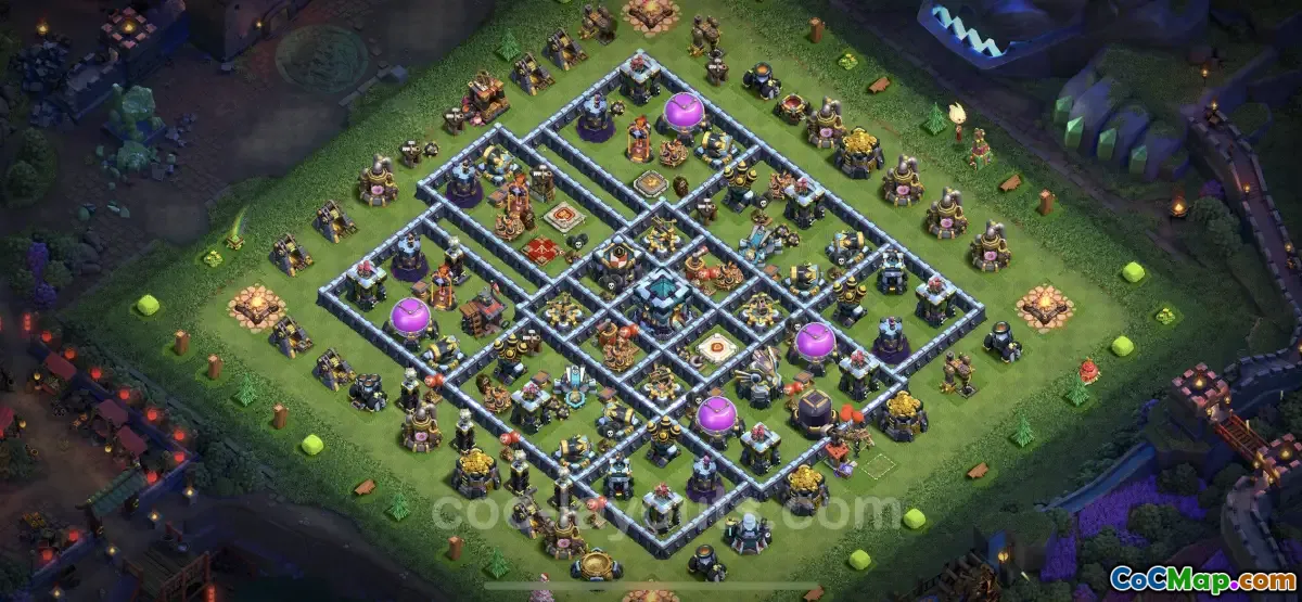 The Town Hall Level 13 base design features a robust layout specifically engineered to counter various attack strategies in Clash of Clans. This structure is known for its anti-dragon capabilities, making it an ideal choice for players who frequently encounter air-based attacks, particularly those utilizing Electro Dragons. By strategically placing defensive buildings and traps, this base minimizes the effectiveness of aerial assaults, providing a strong defense against attackers aiming to dominate from the skies.