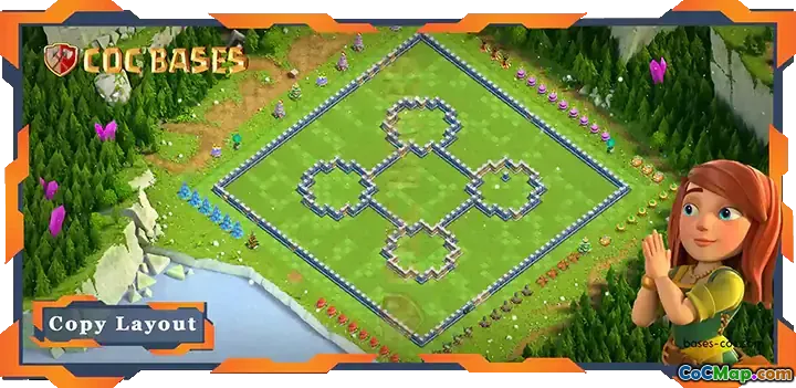 A key feature of this layout is the large central compartment that it incorporates. This compartment plays a pivotal role in the base's defensive strategy by housing essential structures and defensive units. By creating a massive compartment, the design ensures that attackers have to navigate through various defenses to reach the town hall, which is strategically positioned at the center of this compartment.