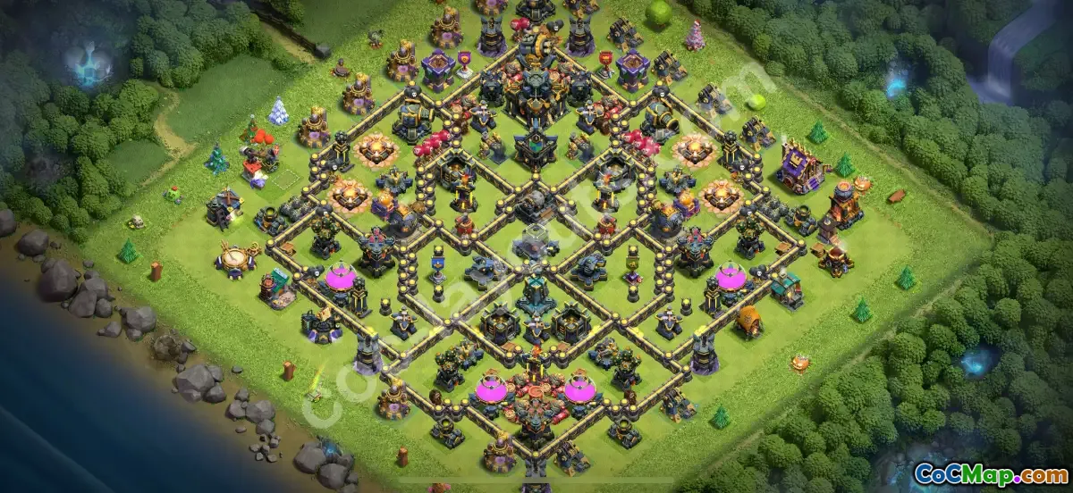 This TH17 farming base is designed specifically to maximize resource protection while preventing attacks from all angles. Its anti-everything setup combines strong defenses, strategic placement of walls, and well-protected resource storages to ensure safe farming during Clash of Clans 2025. The layout is optimized to divert attackers and minimize loot loss, making it ideal for players focusing on resource gathering without risking their progress.