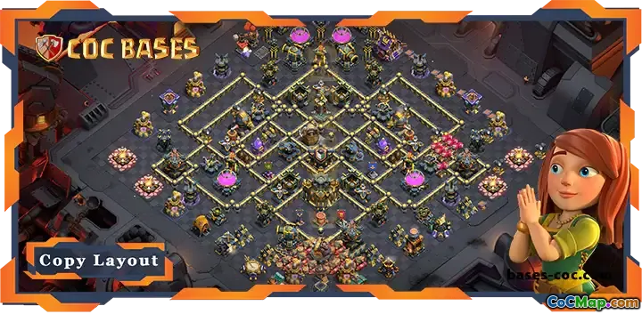 Designed with a balance of core protection and perimeter defenses, this layout ensures your Clan Castle, heroes, and resource storages are well-guarded. You can easily access the layout through the provided link for quick setup and customization, ensuring you stay competitive in clan wars with a solid, anti-3 star defense strategy.