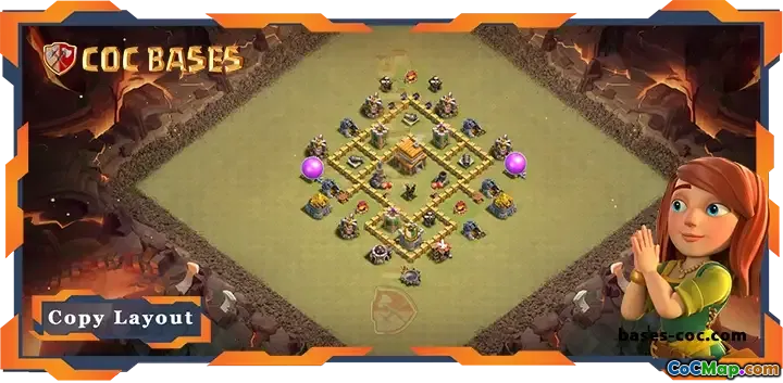 This TH5 war base layout is crafted to provide a comprehensive defense against all attack strategies, making it ideal for clan wars. Its symmetrical design incorporates robust walls, strategically placed traps, and well-protected resource storages to minimize damage from enemy troops.