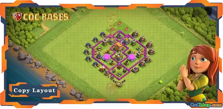 Effective TH6 farming base layout designed to prevent 2-star attacks and maximize resource protection, complete with a custom link for deployment.