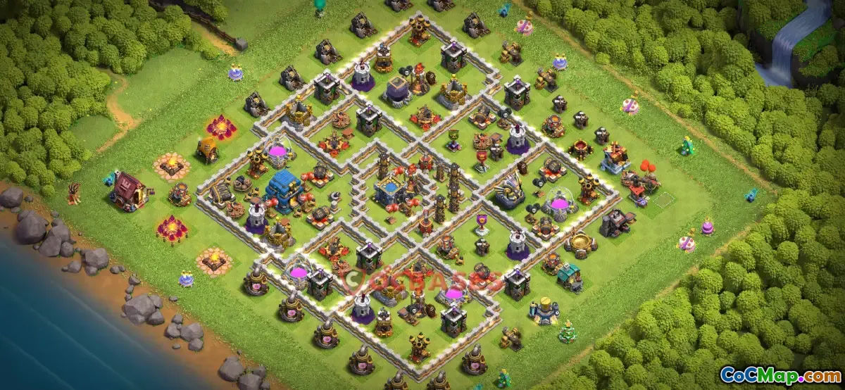The base combines a mix of defensive structures such as Archer Towers, Cannons, and Wizard Towers, positioned to cover the entire layout effectively. It also incorporates walls and traps to slow down or divert attacking troops, preventing easy access to the core. This setup is especially useful for farming purposes, as it allows players to maximize resource gains while minimizing the risk of losing their loot in battles.