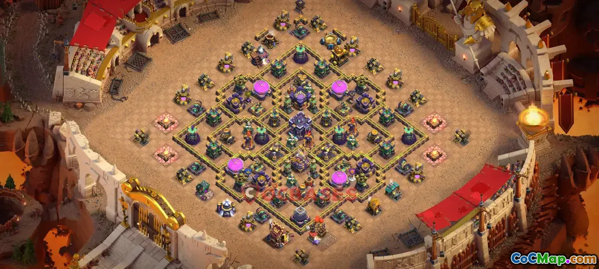 This Town Hall 15 farming base is specially crafted to maximize resource protection while you gradually upgrade your new buildings. Its design focuses on compartmentalizing key resources like gold, elixir, and dark elixir to minimize raid losses, even without the latest Town Hall structures unlocked. The layout provides excellent defenses and traps placement, making it harder for attackers to loot your resources efficiently.