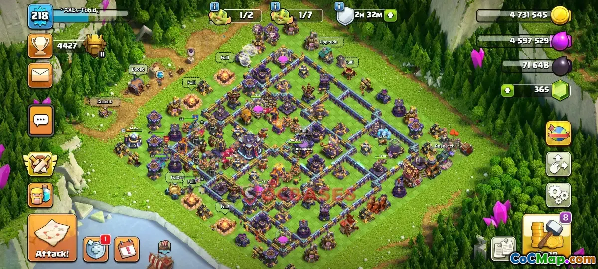 This is a description of a Town Hall 15 hybrid base design for the game Clash of Clans. Hybrid bases are specifically crafted to defend against both attacking strategies involving farming (resource collection) and attacking for trophies, making them versatile and popular among players. The design emphasizes a balanced layout that provides strong protection for resources and the Town Hall, while also maintaining defensive strength for trophy pushing.