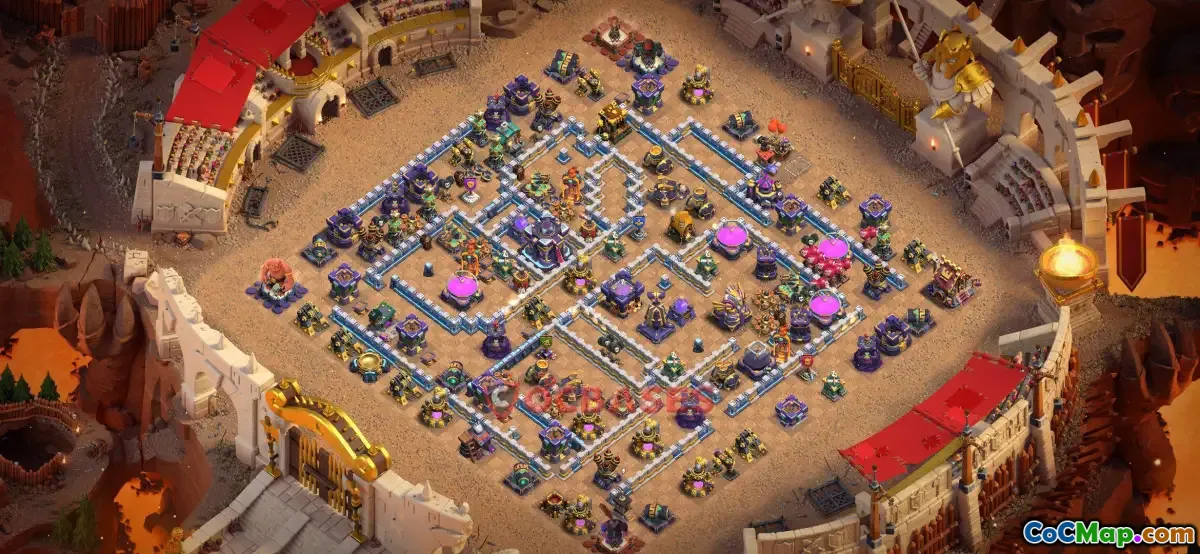 The Town Hall 15 war base in Clash of Clans is designed to maximize defense during clan wars. It typically features strategic placement of defensive structures such as cannons, Archer Towers, and Wizard Towers to cover key areas and protect the Town Hall from attacks. The layout often includes well-planned walls and traps to slow down or divert attacking troops, making it more difficult for opponents to achieve a high percentage of destruction.