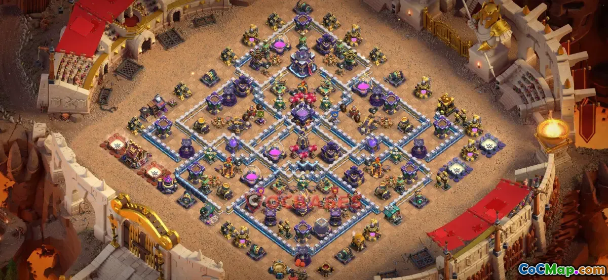 The Town Hall 15 war base in Clash of Clans is designed to provide strong defenses and protect the resources during war attacks. This base layout typically features key defensive structures such as Archer Towers, Cannons, and Wizard Towers strategically placed to cover vital areas. The Town Hall itself is often centrally located to make it difficult for opponents to reach and destroy it early in the attack, thereby preventing a quick victory for the enemy team.