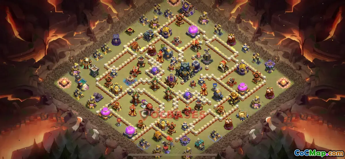 The Town Hall 17 hybrid base in Clash of Clans is designed to optimize defense and resource protection by effectively blending features of both farming and war bases. This type of base layout ensures that resources such as gold, elixir, and dark elixir are well-protected while maintaining the ability to defend against enemy attacks during clan wars. The layout often includes strategically placed walls, traps, and defensive structures to create a challenging environment for attackers, encouraging them to think carefully about how to breach the defenses.