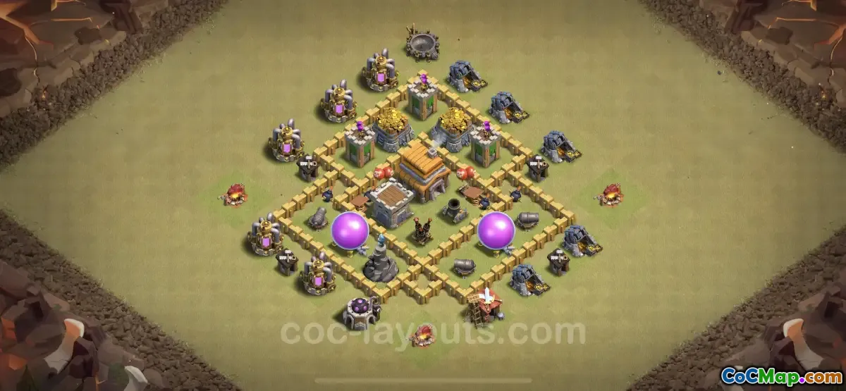 The layout of this TH5 base incorporates various defensive structures strategically placed to create a formidable defense against enemy attacks. Key features include well-positioned walls, traps, and defensive buildings that work together to thwart enemy troops. The design maximizes coverage and provides a challenging target for opponents, thereby enhancing the chances of successfully defending against incoming raids.
