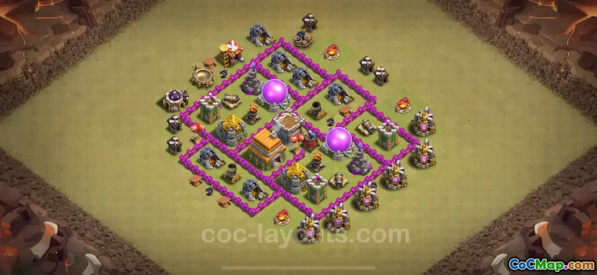 This Town Hall 6 base functions as a hybrid layout, which means it is built to protect resources as well as the Town Hall itself. Players often face challenges in maintaining their resources while also ensuring their Town Hall remains intact. This base successfully meets both objectives by strategically placing defenses and resource storages in a way that they can provide maximum protection without leaving any single structure vulnerable.