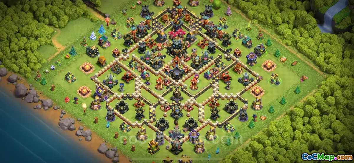 This TH17 base design utilizes clever placement of buildings, traps, and defenses to create a challenging environment for attackers. The strategic arrangement ensures that key defensive structures are well protected while also luring enemies into traps. By fortifying weak points and maximizing the coverage of defenses, players can create a base that not only defends against ground and air assaults but also dissuades attackers from attempting their raids. The aim is to create a fortress that can withstand the most skilled opponents.