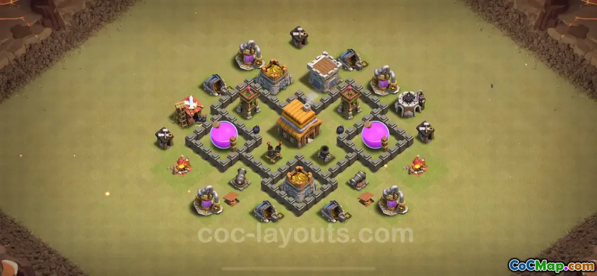 The recommended hybrid base for Town Hall 4 focuses on maximizing the protection of key structures such as the Town Hall and the Clan Castle. This setup often involves placing traps and defenses in strategic locations to deter attackers. For instance, by clustering defenses together, players can create a zone where enemy troops are likely to encounter multiple defensive barriers, slowing down their progress and potentially leading them into traps.