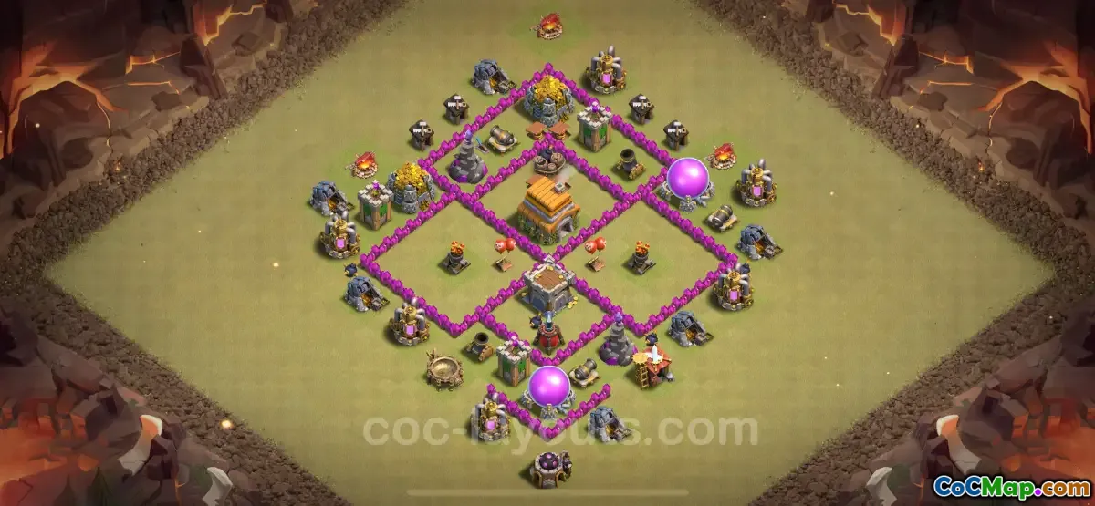 An anti-3 star base is designed to make it difficult for attackers to secure all three stars in a single raid. This is particularly important in CWL, where every star counts and a single base can impact the overall performance of the clan. At TH6, base builders often incorporate defensive structures strategically placed to guard the Town Hall and other key resources, minimizing the chances of a successful three-star attack. Defensive buildings such as air defenses, wizard towers, and hidden traps are often placed to create a layered defense.
