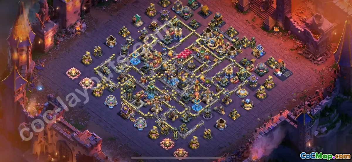 This base design incorporates layered walls, trap placements, and troop deployment zones to mislead attackers and break their attack plans. It is a proven layout that has been tested against top-tier clans, ensuring high survivability and reducing the chance of a 3-star victory. For best results, match this layout with appropriate defensive upgrades and troop placements tailored to your attack style.