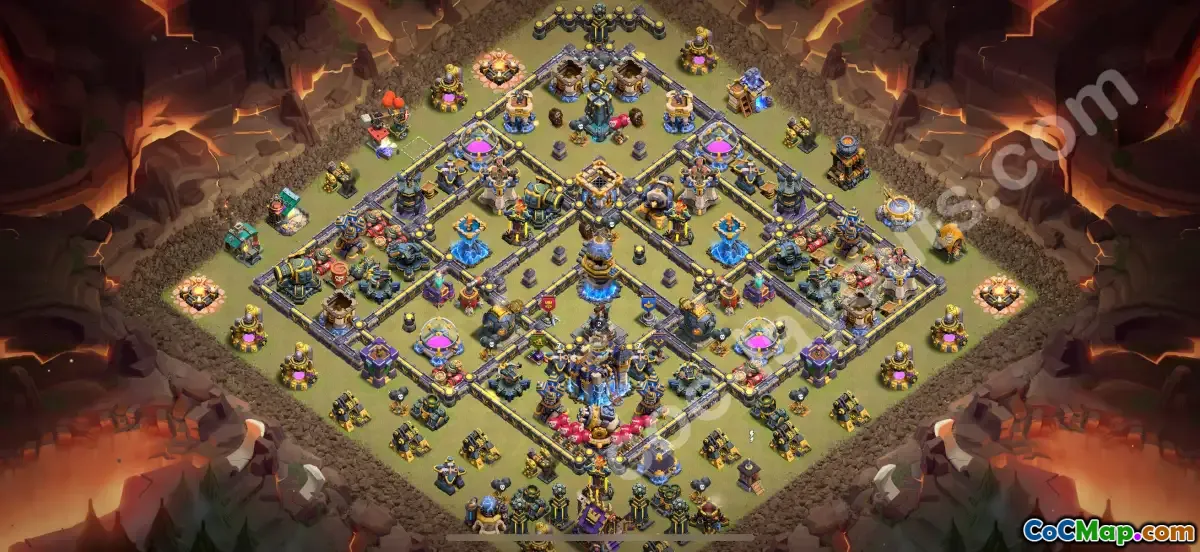 This highly recommended Town Hall 18 CWL war base layout is specifically designed to prevent 3-star attacks by maximizing defensive coverage and critical building placement. It features a well-structured core with key defenses such as Inferno Towers, X-Bows, and Archer Towers strategically positioned to cover all angles, making it difficult for attackers to achieve 3 stars.